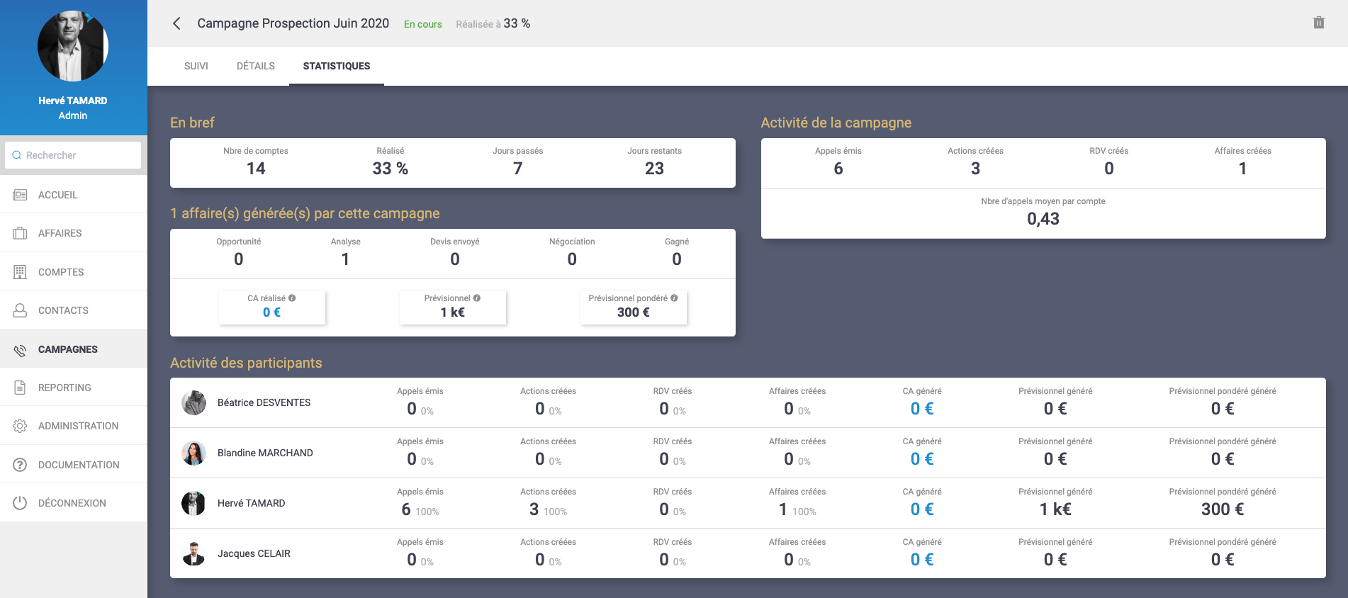 L'onglet "Statistiques" de la campagne permet de suivre l'activité réalisée par cette campagne.