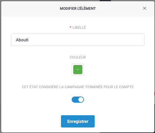 Le pourcentage "Réalisé" se base sur le nombre de comptes dont l'état est paramétré comme "terminé" dans l'administration des états de campagne. Exemple pour l'état abouti :