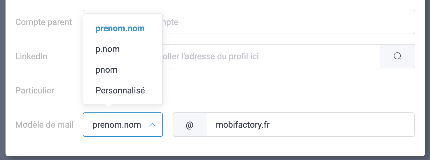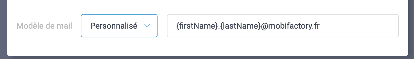 Modèle de mail : {firstName[0]}{lastName[0]}@mobifactory.fr (première lettre du prénom et première lettre du nom)