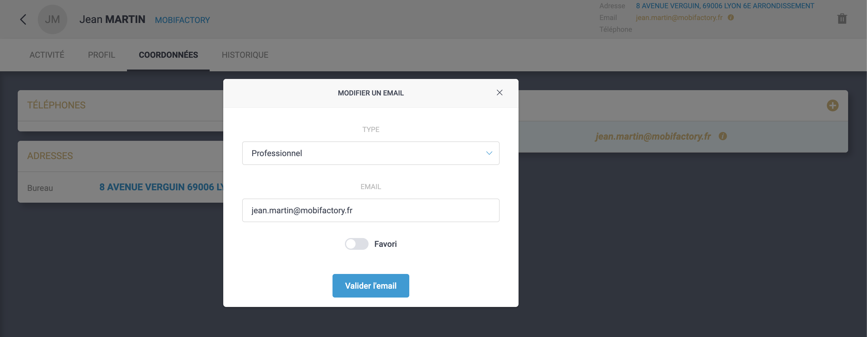 Vous pouvez valider un mail suggéré en cliquant dessus dans les coordonnées. Vous pouvez le modifier à votre guise avant de le valider.