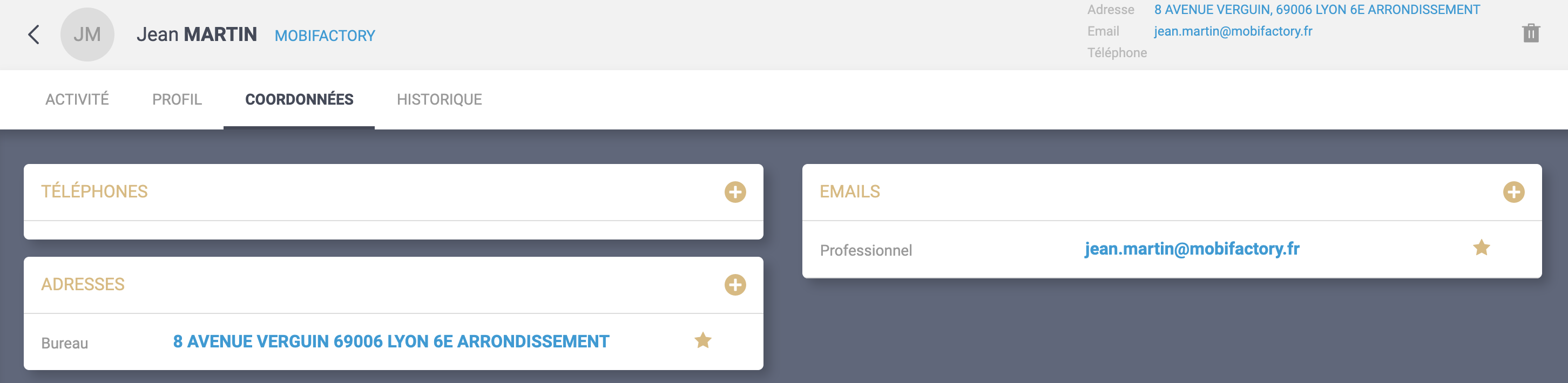1. Le mail suggéré est affiché dans la fiche de détail du contact. Au niveau de l'en-tête et de l'onglet "Coordonnées" (seulement si le contact est lié à un compte et qu'aucun mail professionel n'a été saisi)