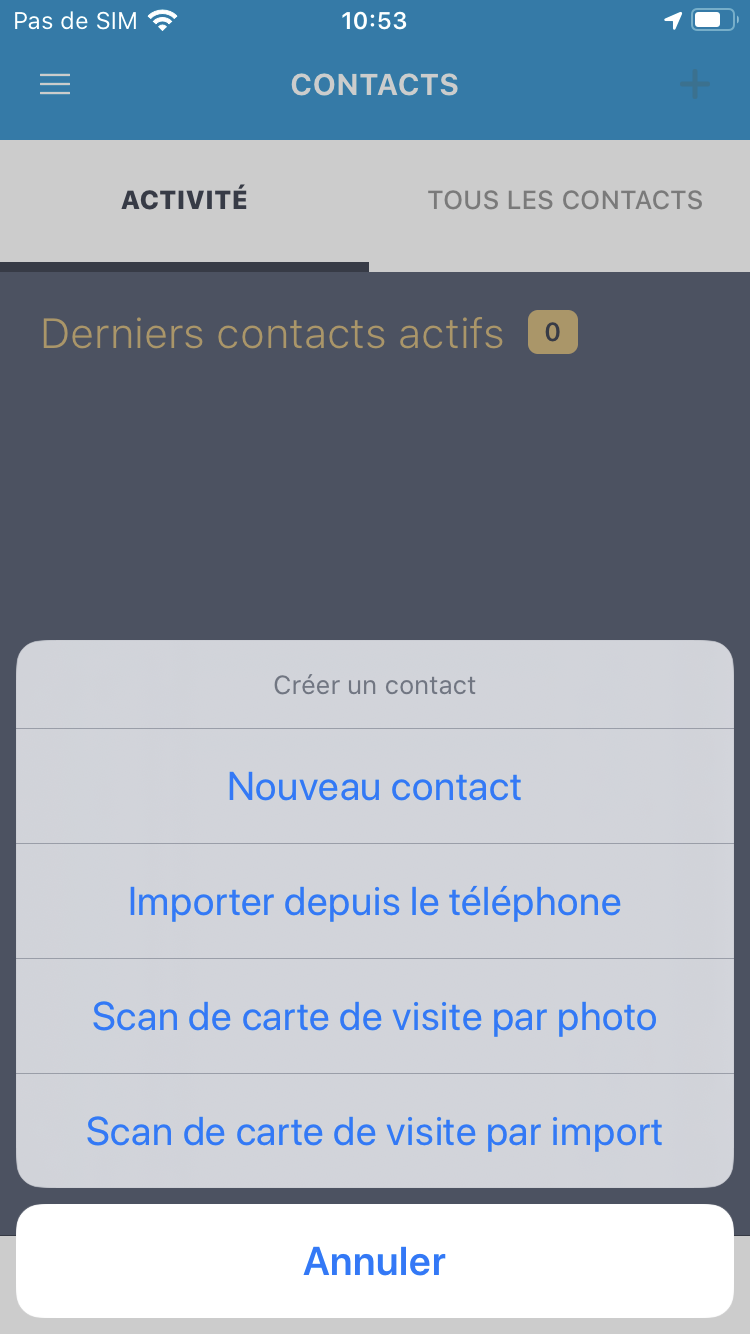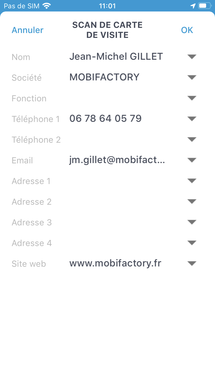 - Scan de carte de visite par photo (prise en photo de la carte de visite)