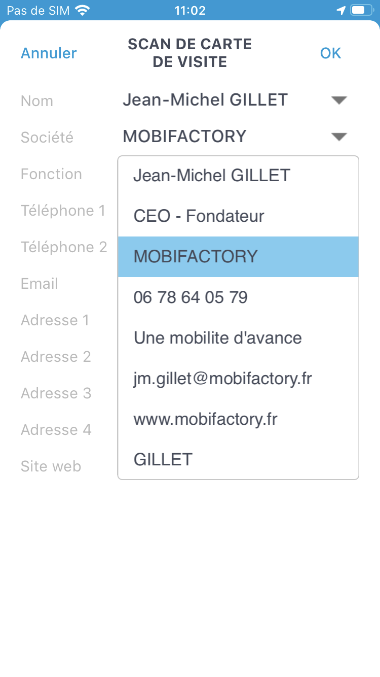 - Une fois la carte de visite sélectionnée, un traitement d'extraction des informations et d'analyse du texte récupère les différentes informations pour les afficher dans la nouvelle fiche intermédiaire de création de contact.