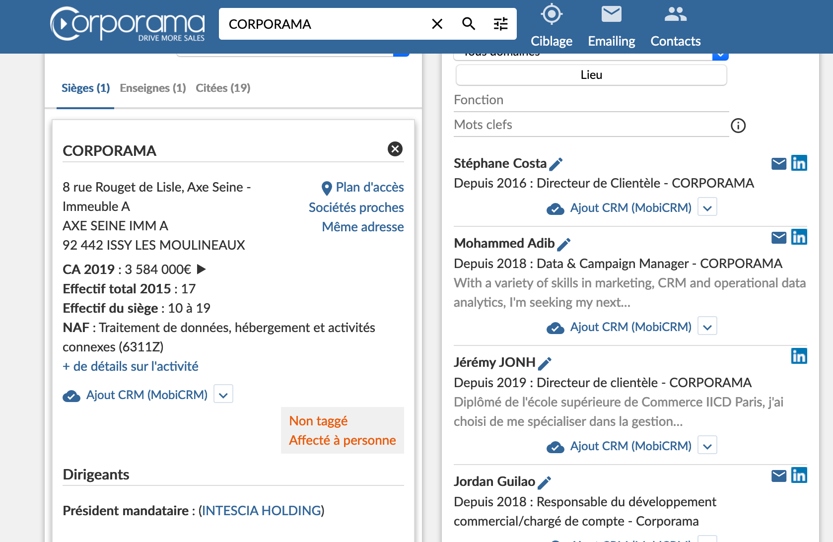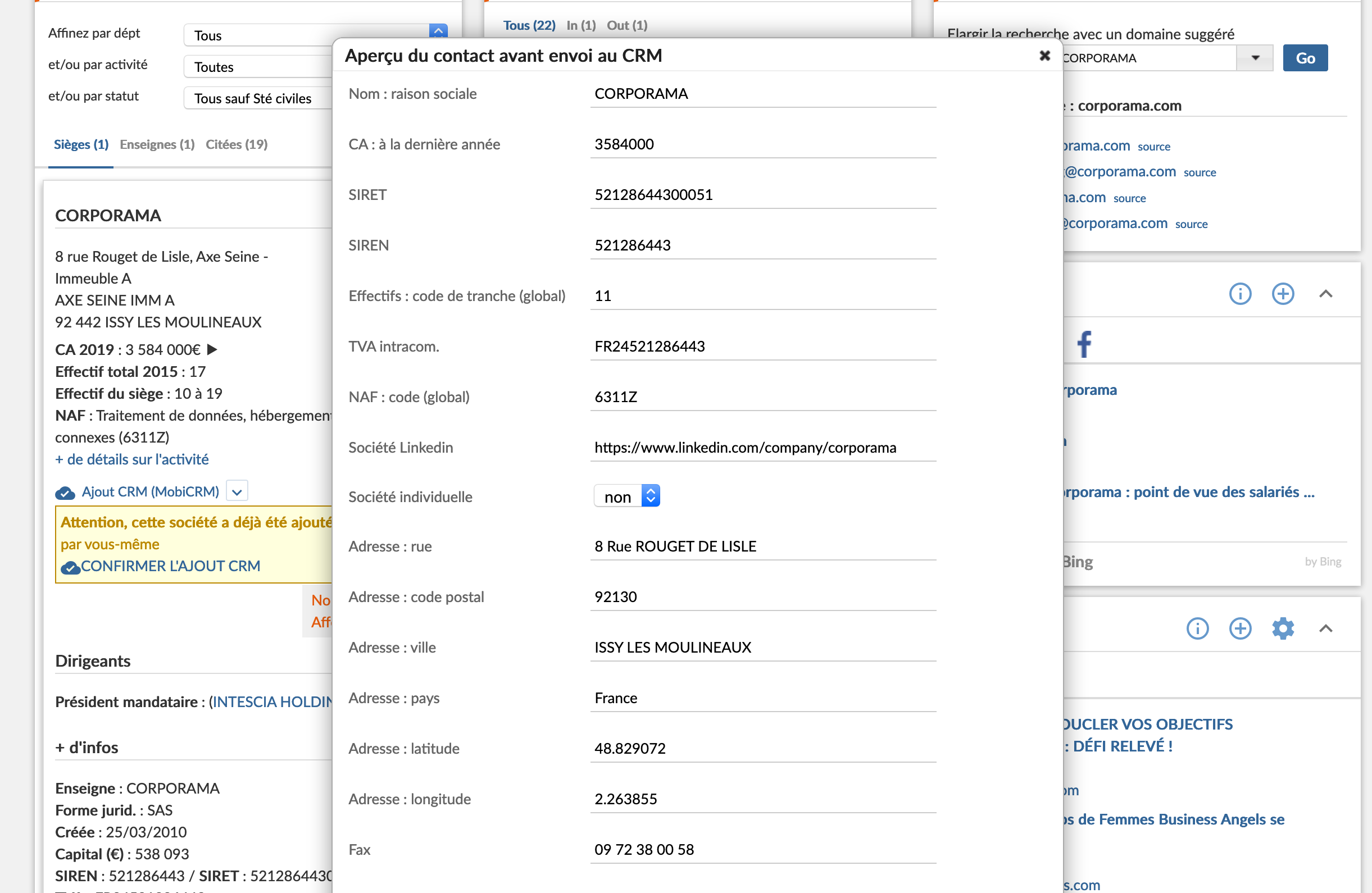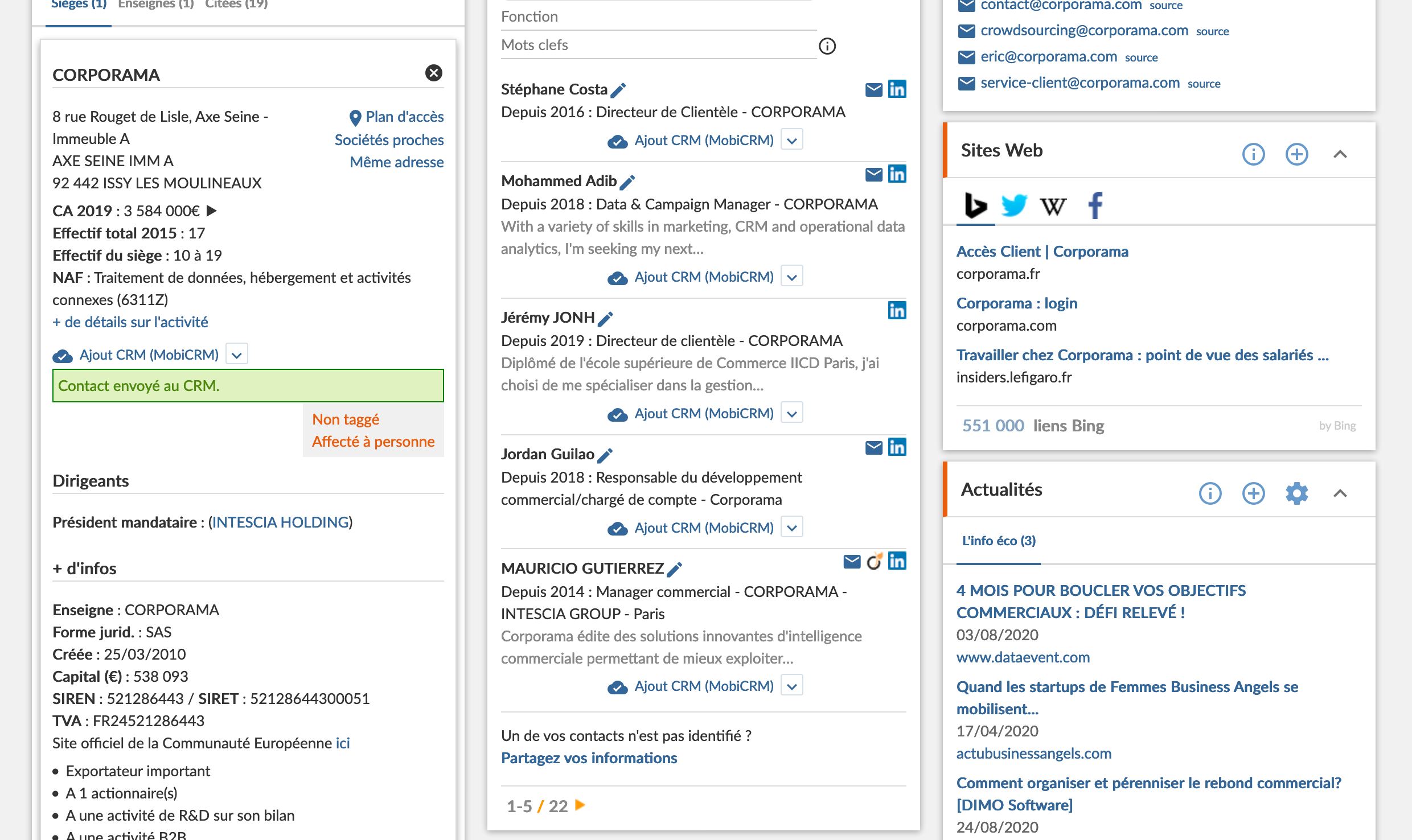 MobiCRM est intégré à la solution d'Intelligence Commerciale et de prospection B2B Corporama.