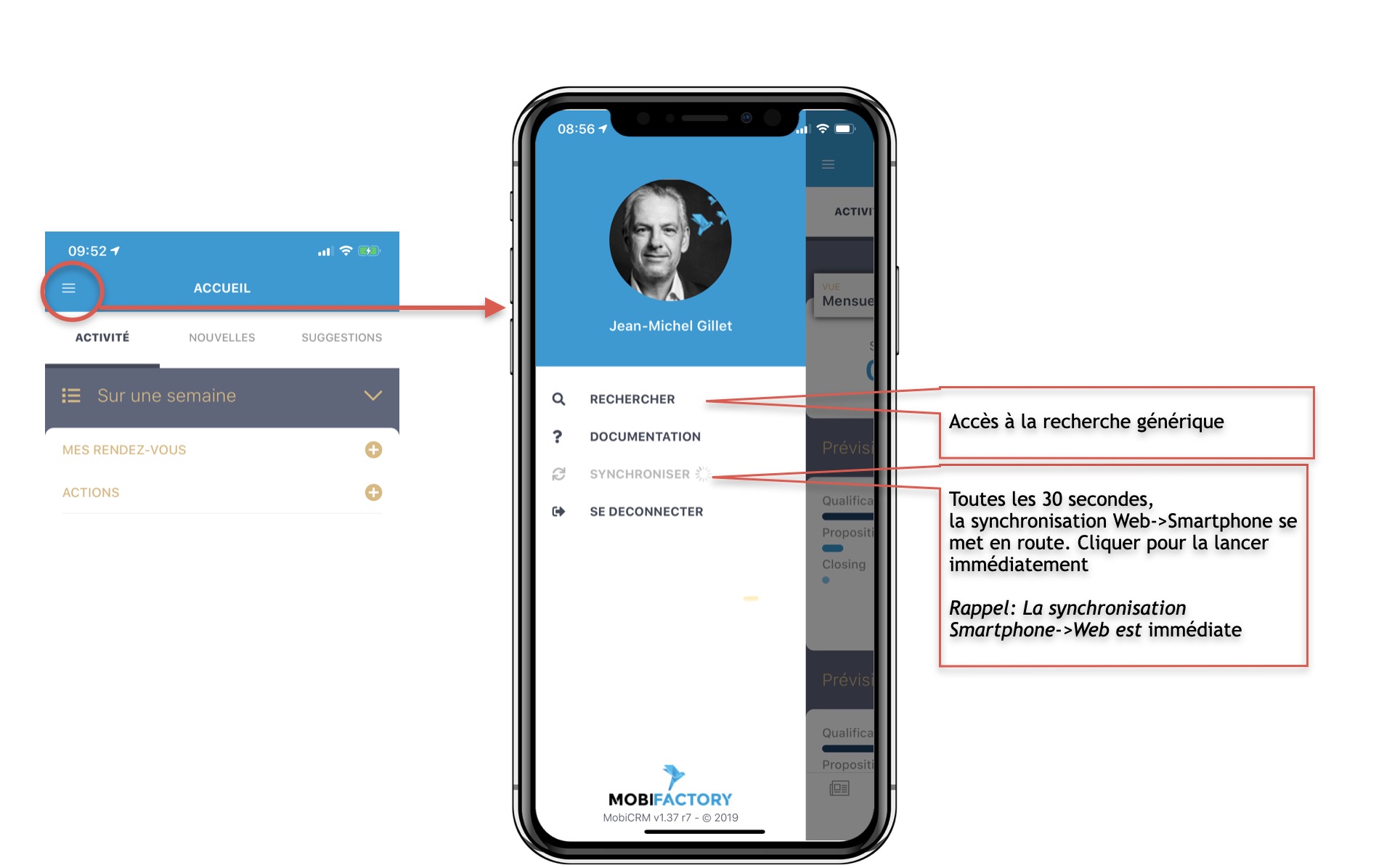 Ce burger menu, accessible depuis tous les écrans, vous permet d'accéder notamment  aux fonctions de recherche et de synchronisation, avec la possibilité de lancer une synchronisation immédiate.