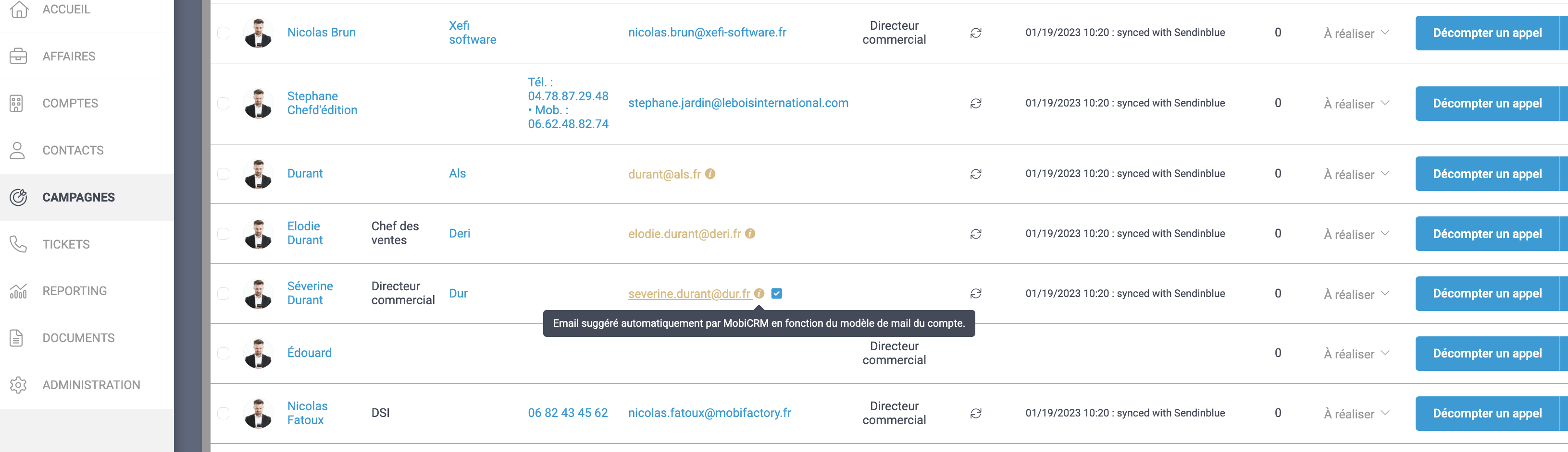 Vous pouvez désactiver l’affichage des emails suggérés (en jaune dans MobiCRM) dans Administration/Paramétrage.