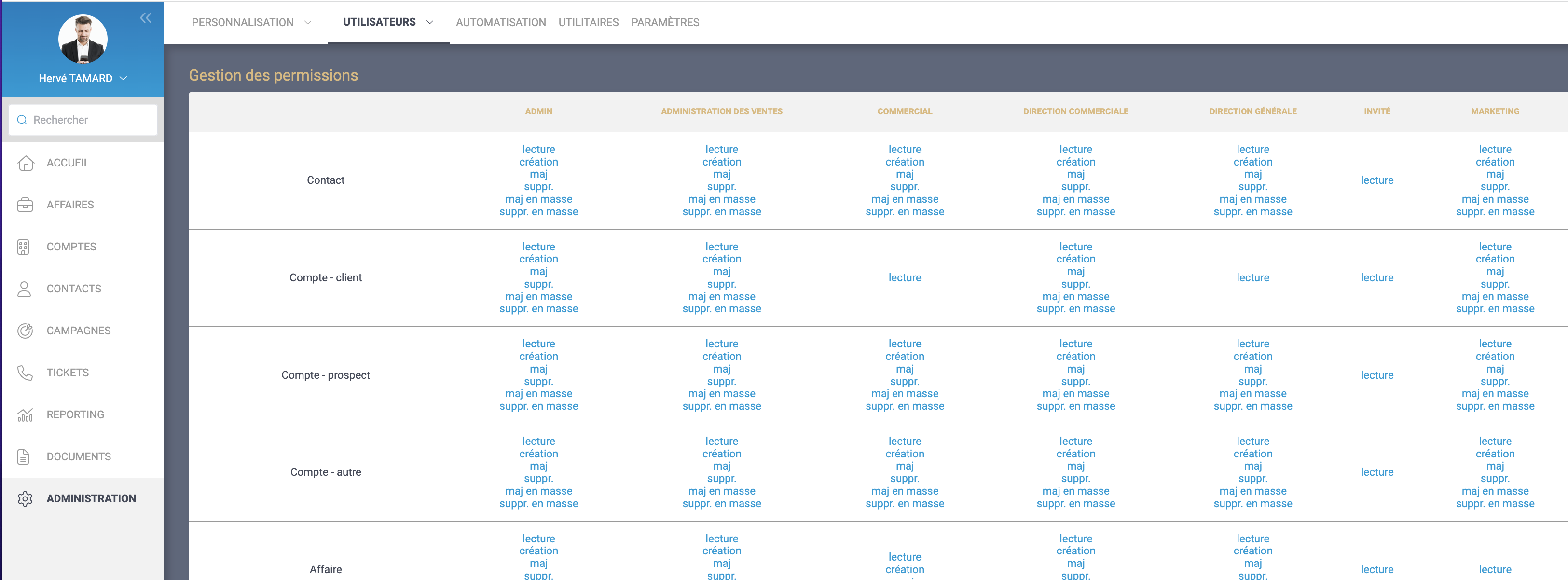Nous avons affiné la gestion des permissions sur les comptes. Vous pouvez désormais décider qui peut créer, modifier, supprimer…des clients, des prospects, des autres types de comptes, par profil utilisateur.