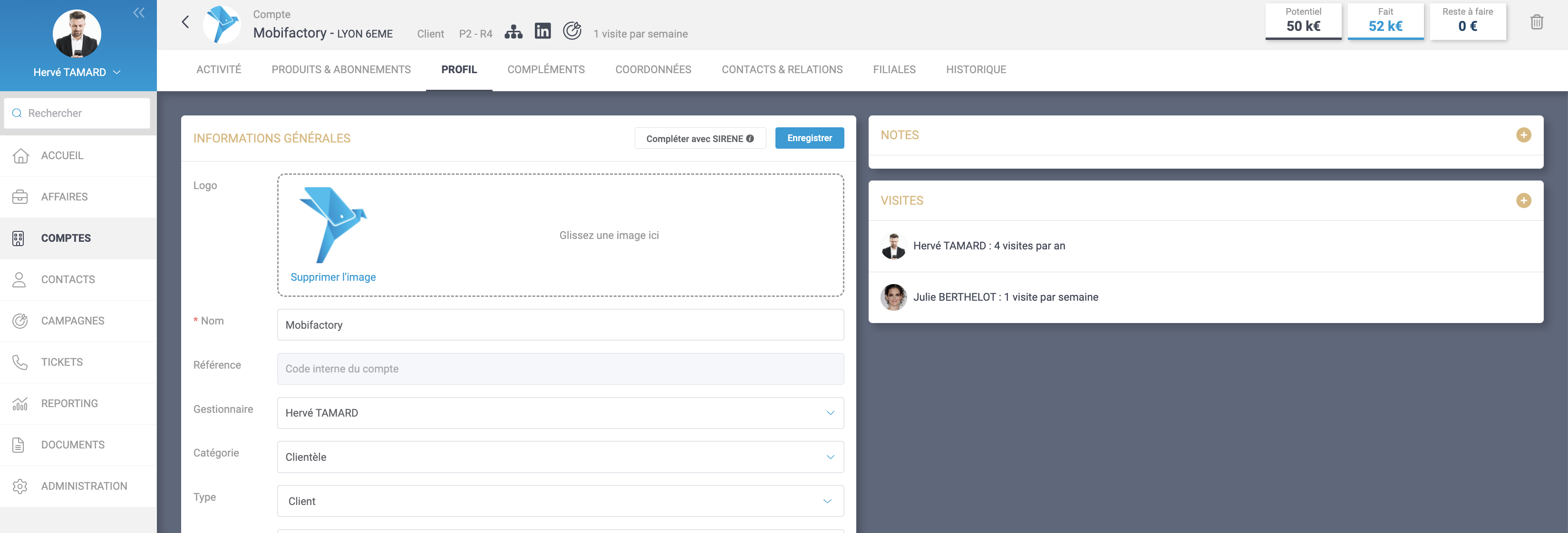 Dans la fiche profil du compte, vous pouvez décider qui doit aller visiter le compte et à quelle fréquence. Vous pouvez aussi juste indiquer que le compte doit être visité, sans préciser par qui, grâce au mode Global.