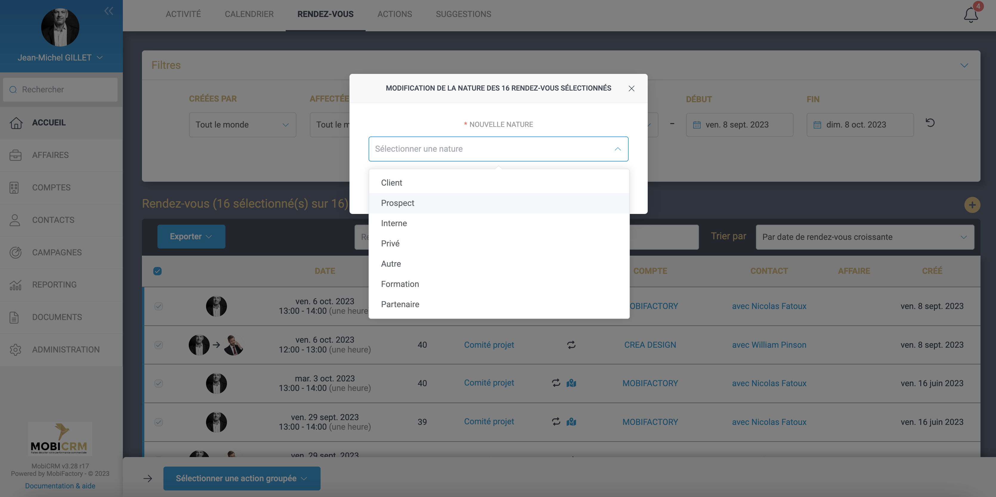 Vous pouvez également exporter et modifier en masse vos rdv, notamment modifier la nature de rdv.